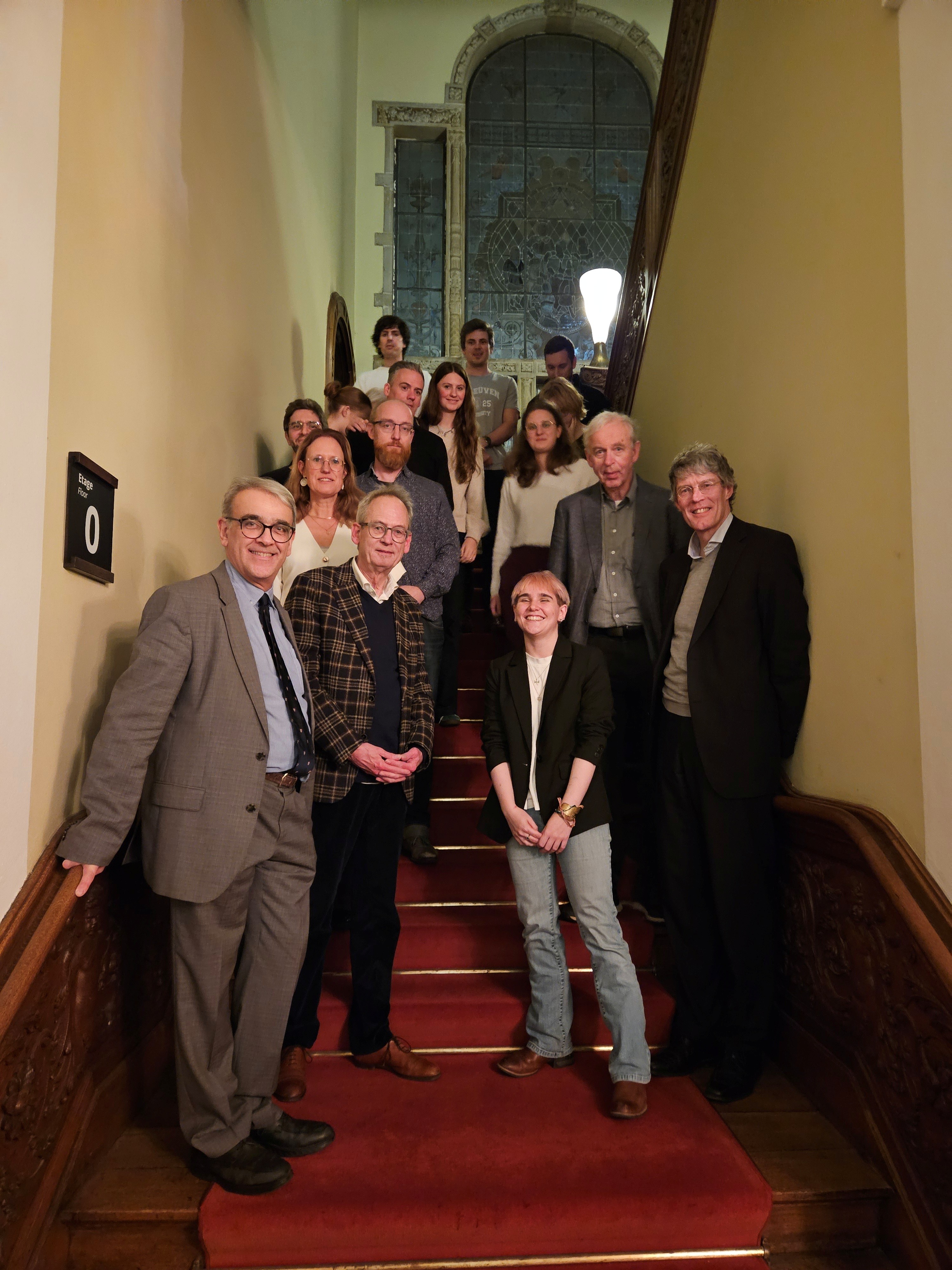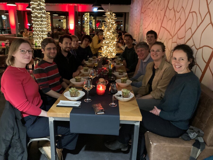 On 1 October 2025, the structure of the RCNP as originally envisioned, i.e. with a tripartite structure represented by three permanent faculty with their respective PhD students, was finally completed with the arrival of Fleur Hubau MSc MA. Fleur will be studying the history and philosophy of chaos theory in physics, under the supervision of Marij van Strien. This line of research is right at the heart of the RCNP's aim to understand the emergence of an apparently deterministic reality from some underlying form of chaotic or random behaviour. In a similar vein, Nino Dekkers MSc, a former mathematical physics student in Nijmegen, started his PhD project under the joint supervision of Mark Peletier (TU Eindhoven) and Klaas Landsman. Nino works on algorithmic randomness and large deviations theory in the foundations of statistical mechanics, with the aim to understand the emergence of irreversible behaviour from reversible dynamics. With these new PhD candidates having arrived, the RCNP office E18.02 was quite busy and vibrant, leading to many thought-provoking discussions on the history and foundations of physics. Throughout September, Matěj Krátký from the University of Geneva joined the RCNP as a visiting PhD student, bringing expertise on the intersection of philosophy of science and modern high-energy physics. He gave a talk on Arrows of Time in the Dapppled World, combining Nancy Cartwright's work with current research on the arrow of time. Earlier that month, we also had Maria Papageorgiou from IQOQI Vienna talk about relativistic quantum measurement, and Frans van Lunteren from Leiden University discuss Physics as Religion. The remainder of the fall saw talks by Carina Prunkl, Nicholas Rebol, Guy Hetzroni, Sanne Vergouwen and Lucy James, most of which can be watched back here. During the same period, we read Bryan Roberts' book Reversing the Arrow of Time. All in all, it was a highly productive fall! To celebrate this, we treated ourselves to a table at the Raboud Christmas dinner: