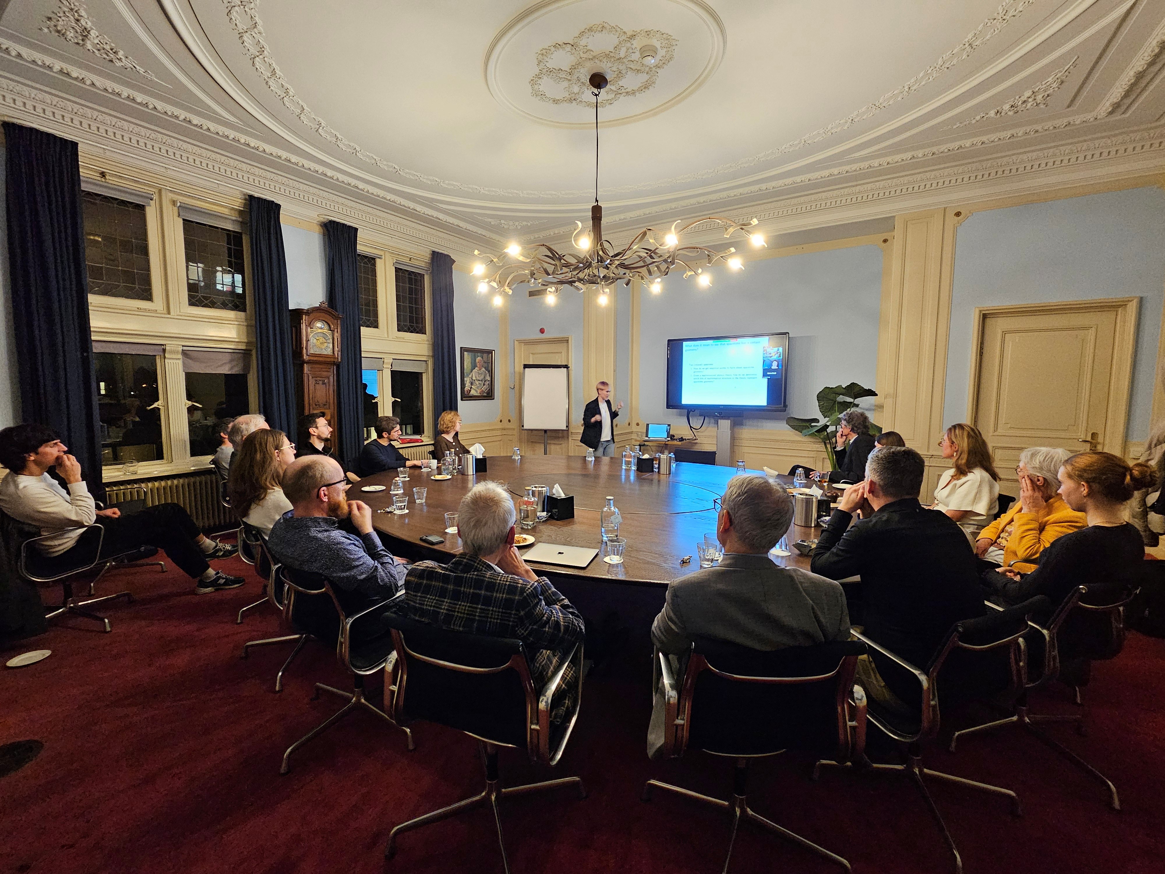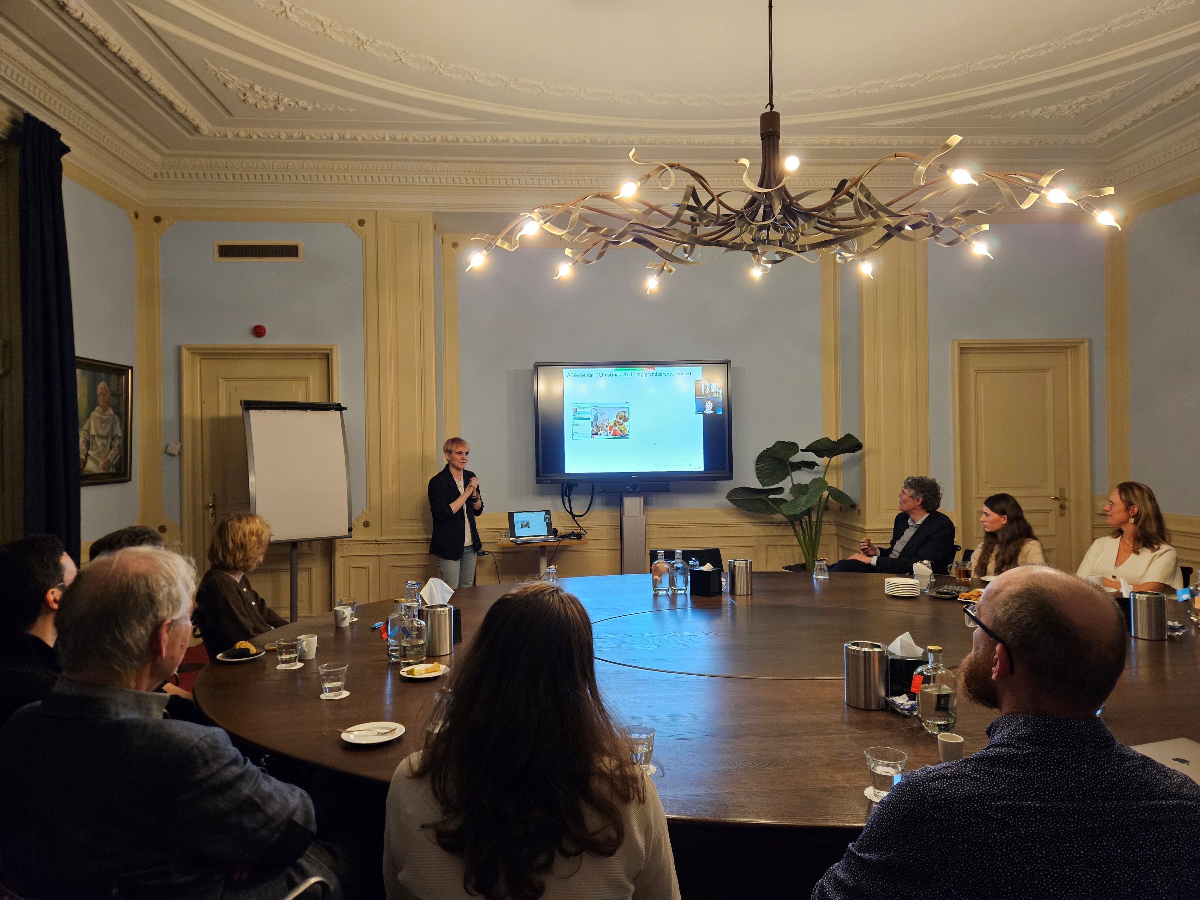 But it did not end there, as we also had the honour of receiving Eleanor March from the Universities of Irvine and Oxford, who won the 2025 Hanneke Janssen Memorial Prize. Impressively, she first gave a three-hour seminar at the RCNP explaining her thesis work (supervised by James Read, making this the first time a winning thesis was submitted by a past laureate), and then gave another talk about her work for a more general audience in the Titus Brandsma room at Huize Heyendaal, attended online by James Read and Fransesca Vidotto: